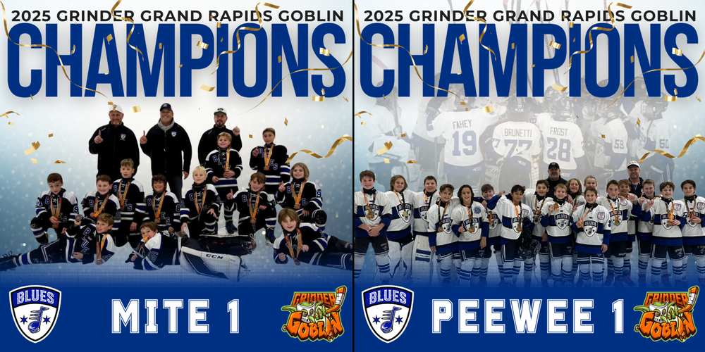 Congratulations to both our Pee Wee 1 and Mite 1 teams, who are returning from Michigan as tournament champions from the Grinder Goblin in Grand Rapids. Both teams were dominant all weekend, with the Mites winning their championship game against Glenview 8-4, and the Pee Wees going undefeated all weekend, winning their final game versus the Lakeshore Junior Lumberjacks 6-1. Way to go, Blues!