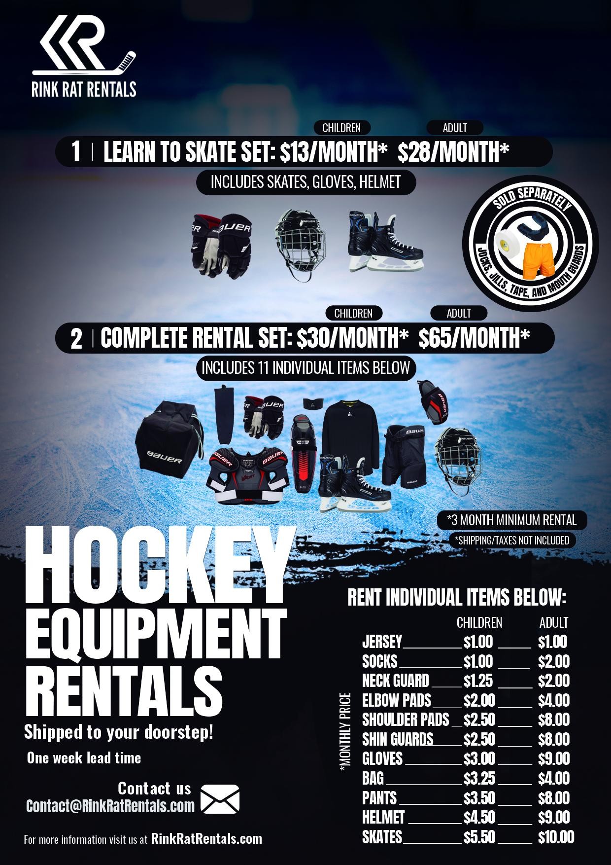 Getting started is simple: visit www.rinkratrentals.com, choose the gear you need, select your rental period, and have it delivered right to your doorstep. Please note there’s typically a one-week lead time on orders, so plan ahead as the season approaches.